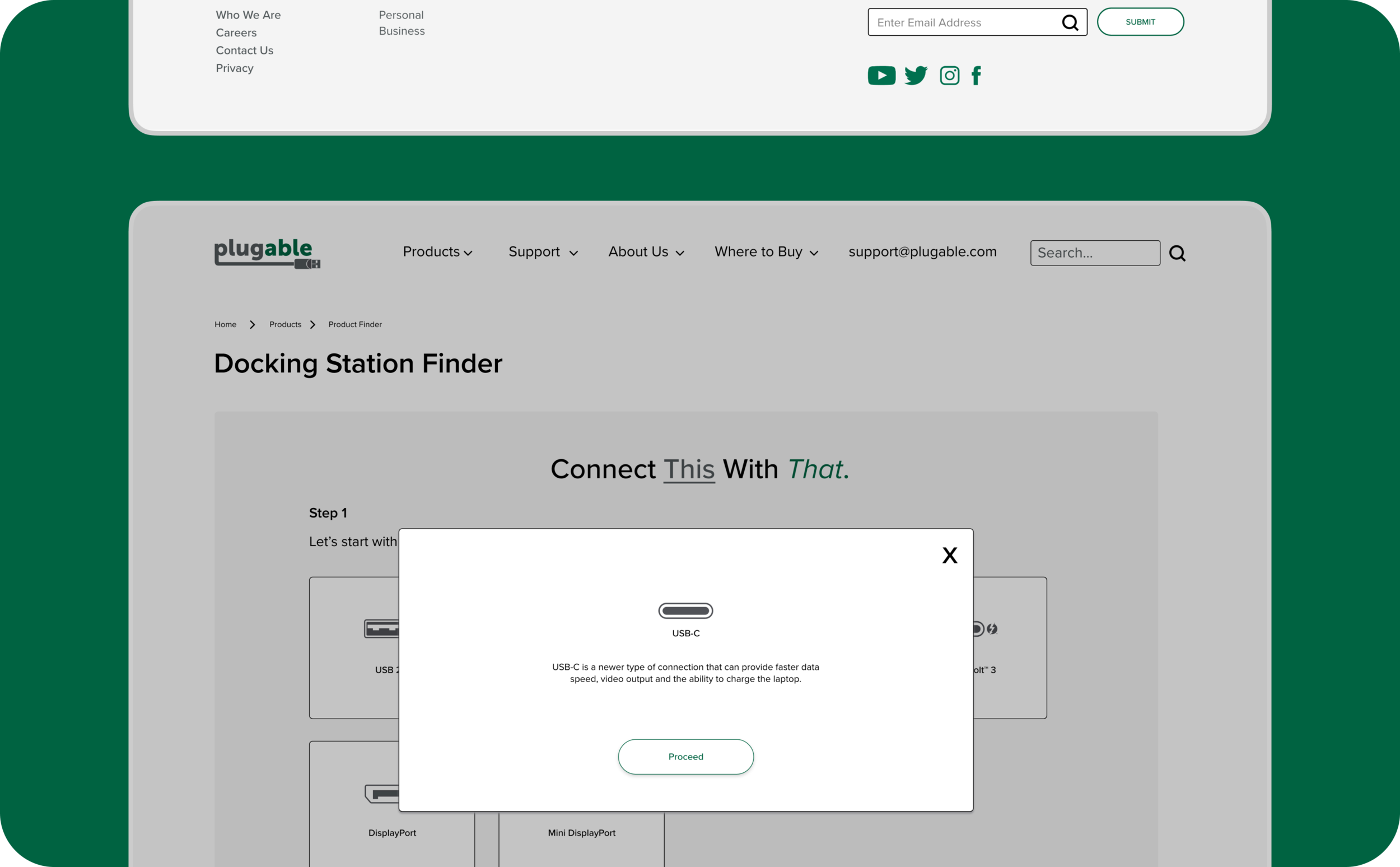 Many individuals look for products to extend their workspace. The most common scenario is finding a product that connects their laptop to multiple monitors, memory devices, and more. With laptops losing ports, and as technology constantly changes it becomes difficult for the average person to find the right product that is compatible for their laptop. Once customers purchase the wrong product it then leads to frustration of having to return the product or even it ending up in landfill. Non-tech savvy customers need an efficient way to confidently find a Plugable product to avoid the hassle of future returns.